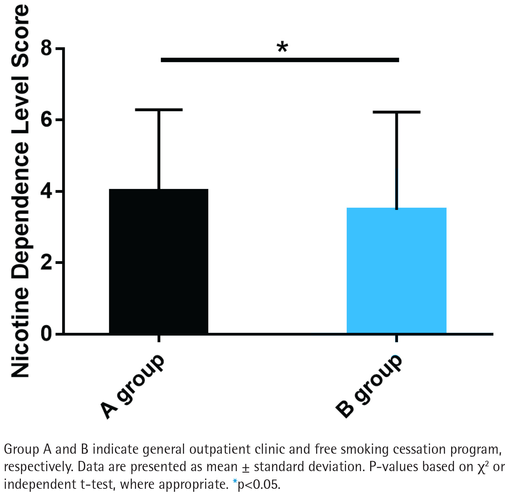 Group B exhibited significantly lower nicotine dependence scores compared to Group A (p<0.05; Figure 2). The mean nicotine dependence score in Group B was 2.8 ± 1.5, while in Group A it was 4.2 ± 1.8. This indicates that the free smoking cessation program may be more effective in reducing nicotine dependence than general outpatient interventions.