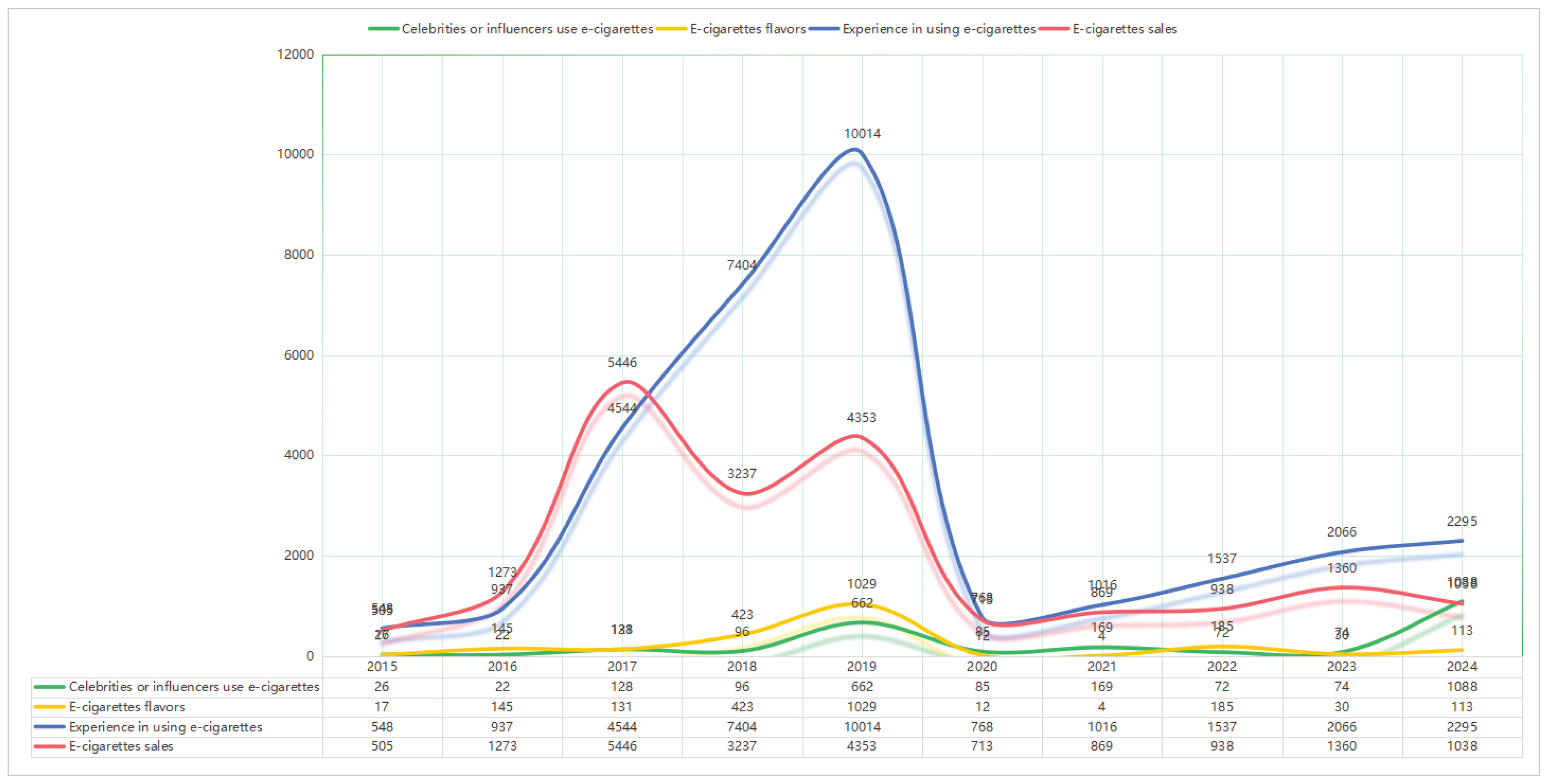 In more detail, topics related to national regulation and public governance –particularly drug control enforcement and tobacco control policies – showed a significant upward trend over the observation period. Mentions of anti-drug campaigns surged dramatically, reaching a peak of 4280 in 2024. This is an interesting finding, as drugs are a serious issue in China, and the metaphorical association of e-cigarettes with drugs indicates a growing public concern about the link between vaping products and illicit substances. Similarly, discussions about tobacco control legislation also steadily increased, peaking in 2022 – the same year that e-cigarettes were officially brought under the national tobacco monopoly framework. This suggests that our basic hypothesis is correct: as policies advance, related discussions are increasingly prevalent. These can be viewed as anti-e-cigarette discourses growing in tandem with the implementation of stricter policies.