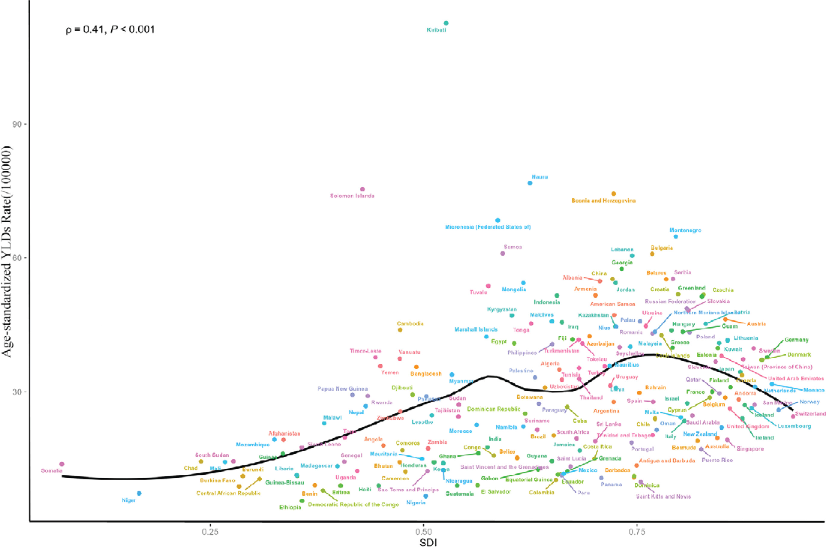 From 1990 to 2021, in most GBD regions, the burden of CVD attributable to smoking gradually decreased with the rise in the SDI. As socioeconomic levels improved, public awareness of the harms of smoking increased, leading more individuals to take measures such as quitting smoking, which effectively reduced smoking-related health risks. Furthermore, our study revealed a nonlinear positive correlation at the national level in 2021 between the SDI and the ASYR due to smoking-related CVD, suggesting that higher SDI countries tend to have a greater YLDs burden. In low-SDI regions, the burden of CVD due to smoking may be partially driven by deficiencies in the local healthcare system27. In contrast, in high-SDI regions, the increase in age-standardized YLDs rates of cardiovascular diseases may be more closely associated with other cardiovascular risk factors in these regions, such as obesity, stress, and longer life expectancy28,29. A global study on obesity revealed that the prevalence of obesity is higher in developed countries than in developing nations30. Notably, Kiribati, despite being a low-SDI region, had an ASYR significantly above the average, likely due to high smoking rates driven by lax tobacco control measures. These findings suggest that tobacco-related CVD prevention strategies should be tailored to the specific needs of regions with different SDI levels.