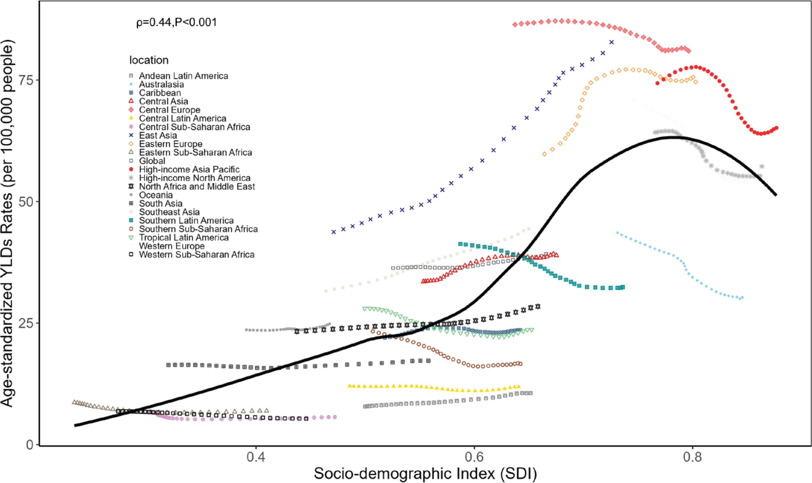 The Sociodemographic Index (SDI) is a composite indicator that reflects the social and economic development levels influencing health outcomes across different regions. It is derived by calculating the geometric mean of three parameters: mean years of education for individuals aged ≥15 years, fertility rates for women aged <25 years, and lag-distributed income per capita. SDI values range between 0 and 114. Notably, when reporting SDI values in GBD 2021, the calculated SDI values were multiplied by 100, resulting in a scale from 0 (highest fertility, lowest education, and lag-distributed income) to 100 (lowest fertility, highest education, and lag-distributed income). To describe the relationship between SDI values and the disease burden across different countries and regions, all areas were divided into five SDI categories: low (<0.47), low-middle (0.62–0.71), high-middle (0.71–0.81), and high (>0.81)11.