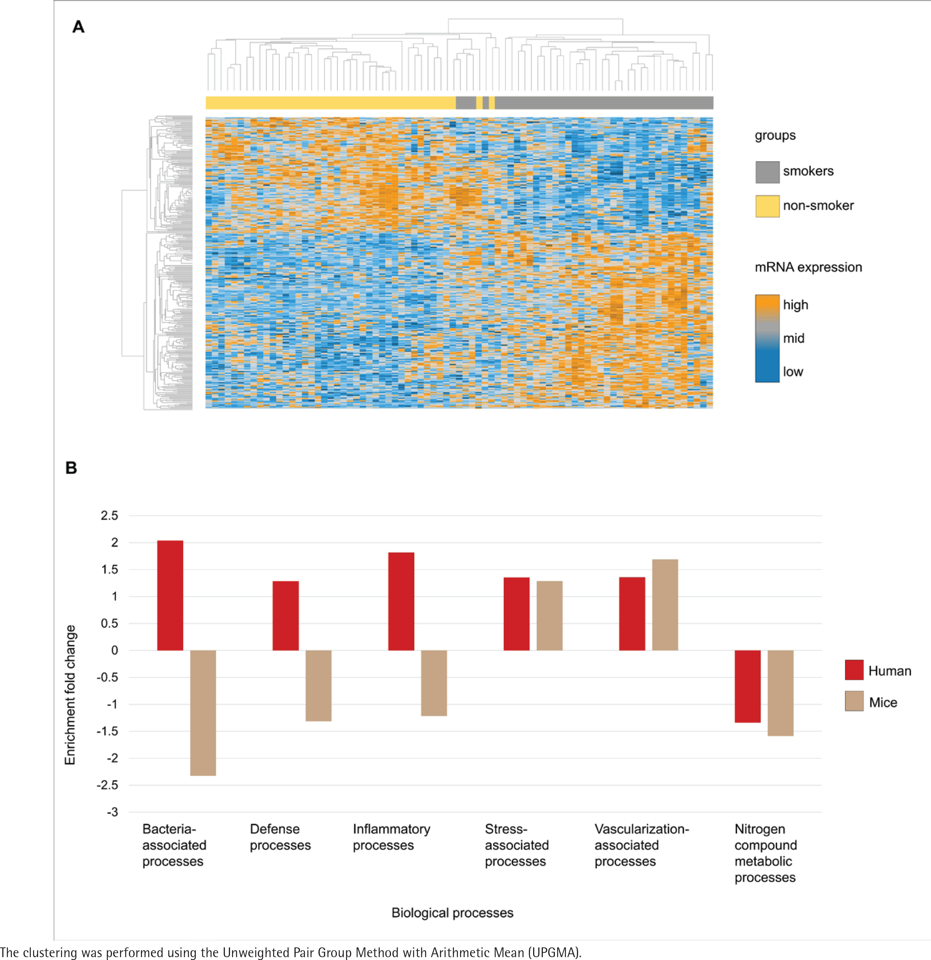 Comparative transcriptome analysis and gene ontology in smokers and non-smokers: A) Heatmap of the oral mucosa human transcriptome, displayed as z-score normalized expression values; B) Gene ontology analysis of the common biological processes of humans and mice from the public transcriptome datasets. Transcripts are organized in rows (upregulated genes in orange, not regulated in grey, and downregulated in dark blue) and groups in columns (smokers in grey and non-smokers in yellow). Humans (red) and mice (brown)