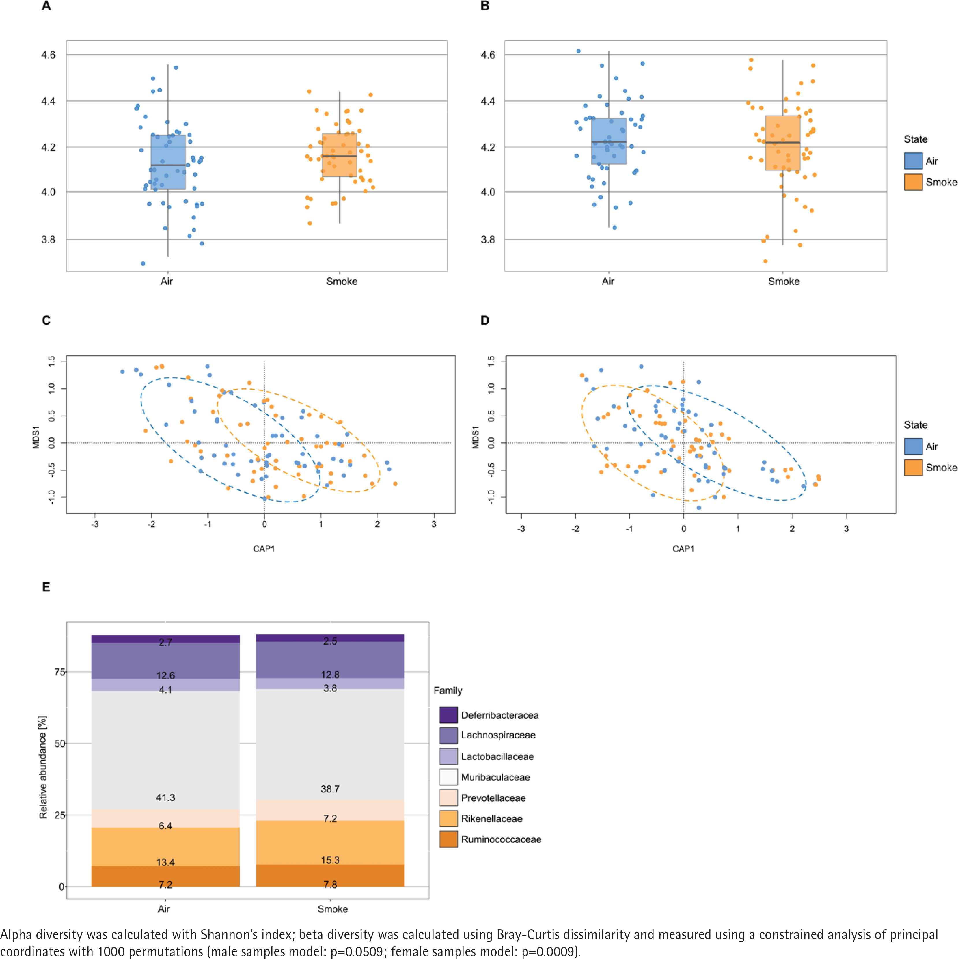 Alpha diversity, beta diversity and relative abundance: A) Alpha diversity in male samples (n=110); B) Alpha diversity in female samples (n=109); C) Beta diversity in male samples (n=110); D) Beta diversity in female samples (n=109); E) relative abundance of common families between air and smoke-exposed animals (n=219). Air-exposed group (blue) and smoke-exposed group (orange)