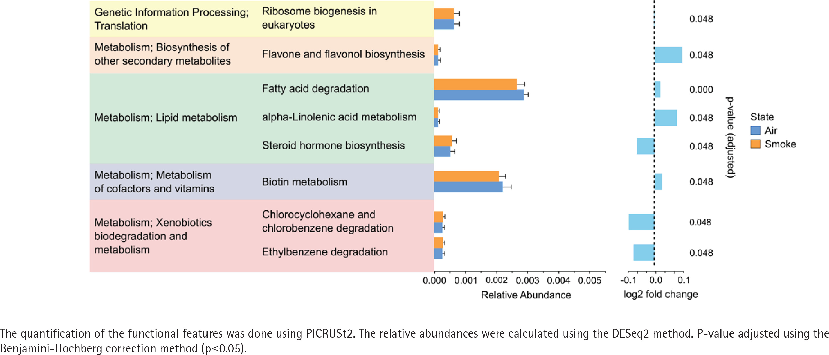 Functional characteristics associated with these families under air-exposed and smoke-exposed conditions were analyzed using PICRUSt2 (version 2.3.5) in Python (version 3.6.8). These results were subsequently analyzed for pathway differential abundance analysis (DAA) using the DESeq2 method, which includes a log2 transformation. The annotations were based on the Kyoto Encyclopedia of Genes and Genomes (KEGG) pathway descriptions in R, utilizing the ggpicrust2 package (version 1.7.3), which included the resulting p-values being adjusted via a Benjamini-Hochberg correction.