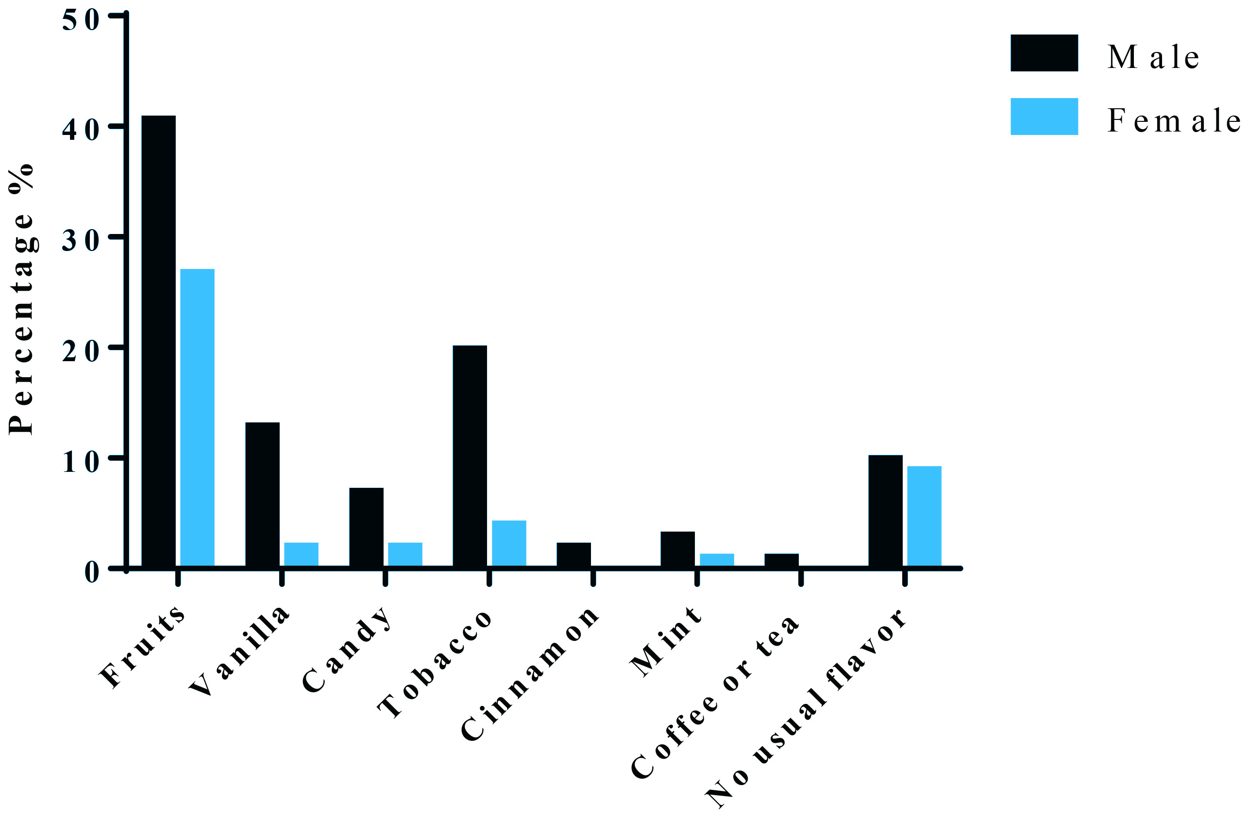 Our questionnaire also included a question about which flavor is popular. It was noted that 40.6% of male versus 26.7% of female vapers preferred fruit flavors. Furthermore, 19.8% of males vs 3.9% of females used tobacco flavors as well as 9.8% of males and 8.8% of females did not have a usual flavor. Candy flavor was also used by males with a percentage of 6.9% and by females with a percentage of 2%. Finally, the least preferred flavors were mint, coffee or tea and cinnamon (Figure 1).