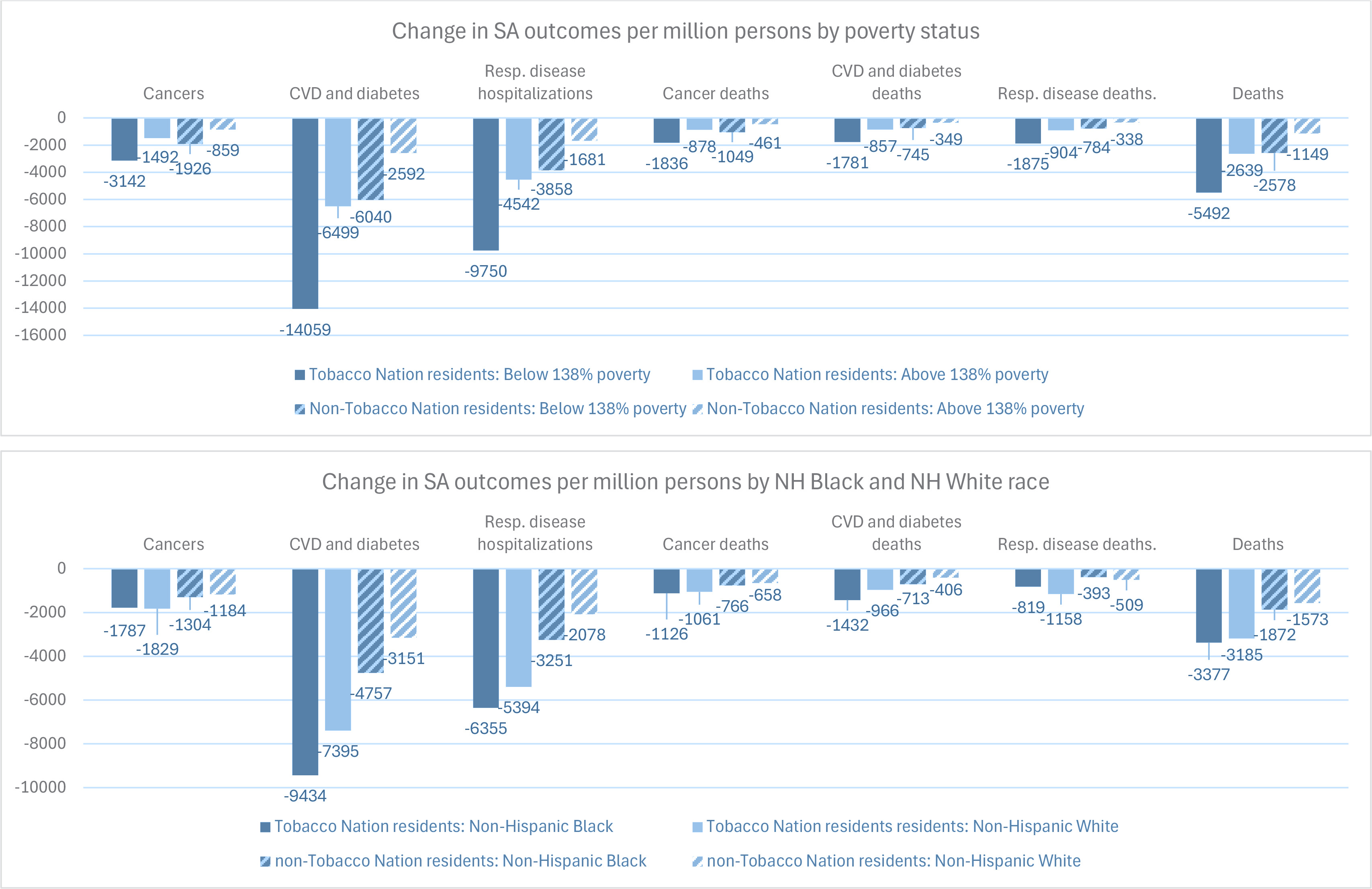 Unsurprisingly, the combined tax and TCE scenario would reduce smoking and smoking harms by a larger magnitude than the tax-alone scenario for all sociodemographic subgroups examined. Both policy scenarios are also predicted to reduce smoking-related disparities by poverty status and reduce some smoking-attributable disparities between NH Black and NH White Tobacco Nation residents. Disparity reductions for NH Black individuals appear to arise from higher baseline risk of SA conditions, not from greater reductions in smoking prevalence. While the tax-only policy scenario is projected to reduce relative disparities by poverty status less than the combined policy scenario, Tobacco Nation residents in all population subgroups examined would experience the greatest reductions in smoking and SA health outcomes from the combined policy scenario.