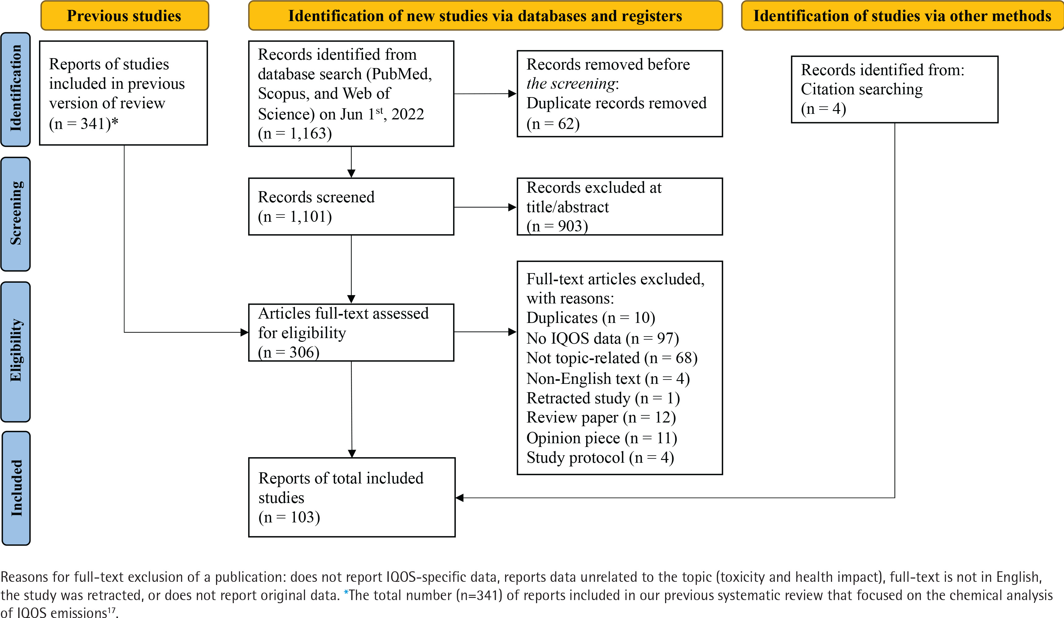 We previously reported a systematic review on IQOS conducted on 8 November 2021, on Web of Science, PubMed, and Scopus using the terms ‘heated tobacco product’, ‘heat-not-burn’, ‘IQOS’, and ‘tobacco heating system’17. For the current scoping review, we looked at articles that assessed IQOS toxicity and health effects from our previous search. We also included more recent articles using the same search terms and methodology (up to 1 June 2022). Only reports written in English were included. A publication was excluded if it did not report IQOS-specific data, reported data unrelated to the topic (toxicity and health impact), or if the study was retracted or did not report original data. Figure 1 summarizes the selection process.
