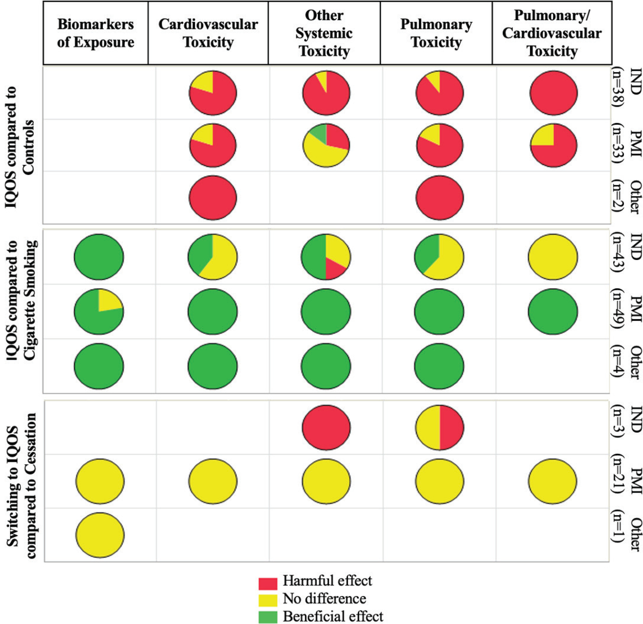 Comparison of toxicity and health impact of IQOS in publications from independent research (IND), PMI, and other HTP manufacturers (Other) to control, cigarette smoking, and smoking cessation conditions. Empty boxes mean that no studies are available in this category
