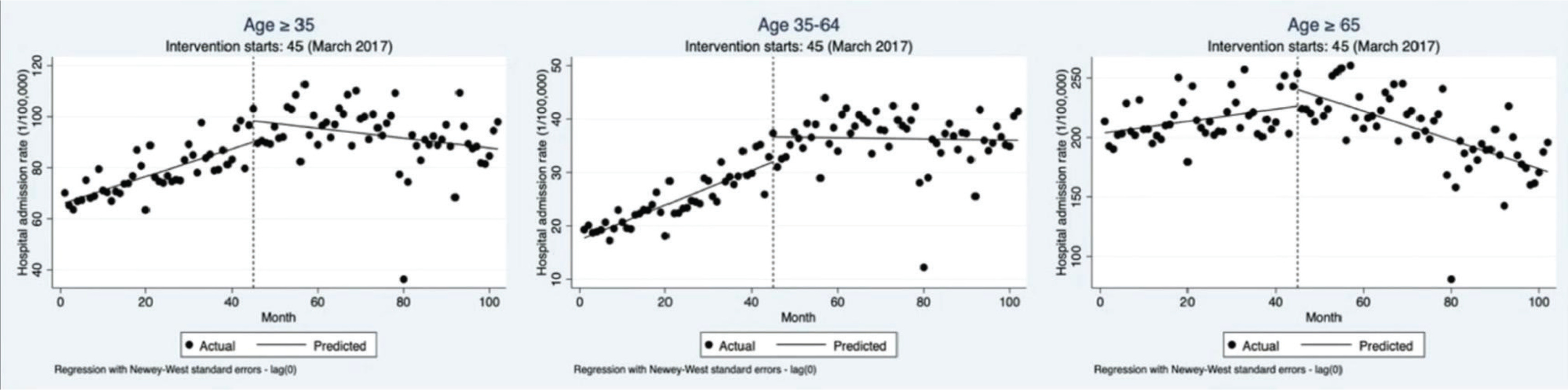 where Y represents the outcome variable (monthly hospitalization or mortality rate); Tt represents the time since the start of the study; Xt is a dummy variable representing the intervention (0 for preintervention, 1 for post-intervention); and XtTt is an interaction term; β0 is baseline hospitalization or mortality rate at the start of the study; β1 is the slope of the outcome variable before intervention introduced; β2 represents the immediate level change in the outcome variable after the intervention and β3 represents the difference in trend slopes before and after the intervention.
