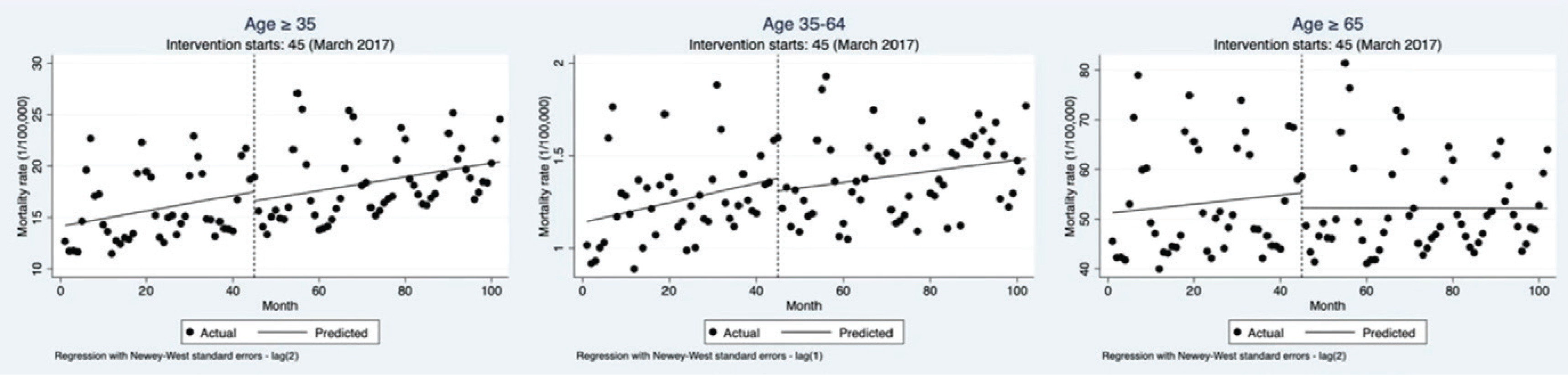 The results for monthly mortality rates differed from the hospitalization rates, as there was no evidence that the policy intervention led to a significant reduction in mortality rates. Among residents aged >35 years, the mortality rate showed a slight decline on step change (β= -0.90; 95% CI: -4.76–2.95) and an insignificant decrease on post trend (β= -0.0075; 95% CI: -0.14– 0.12) (Figure 2, Table 3).